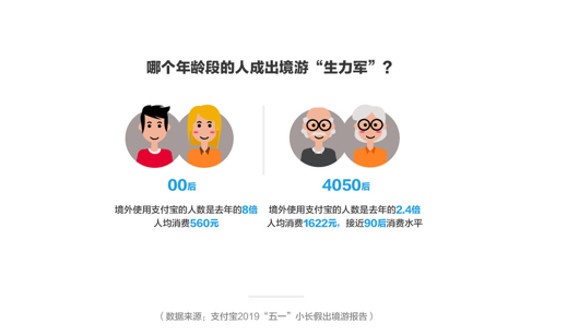 从人数和消费水平看,00后在境外使用支付宝的人数迅猛增长至去年的8倍,人均消费560元;而40、50后在境外使用支付宝人数也达到了去年的2.4倍,而且人均消费1622元,也接近90后消费水平。