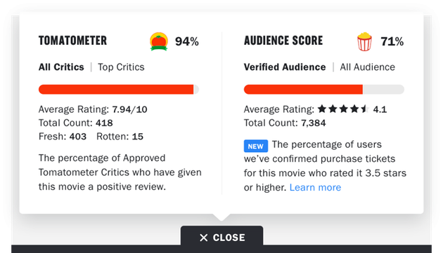 据外媒The Verge报道,烂番茄正在向其观众评分系统引入经过验证的评分和评论功能,以防止“评论轰炸”。根据烂番茄博客的最新消息,该网站现在根据“我们已确认购买电影票的用户”的评分显示整体观众评分分数。